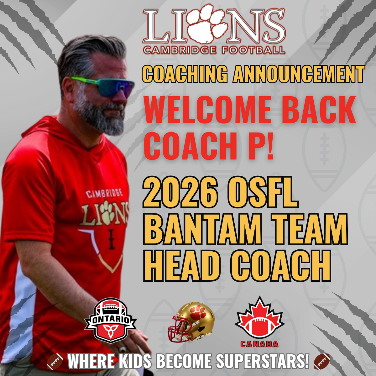 The Cambridge Lions are equally proud to announce the return of Coach Paulo Castelli (Coach P) as Head Coach of the 2026 OSFL Bantam Team!